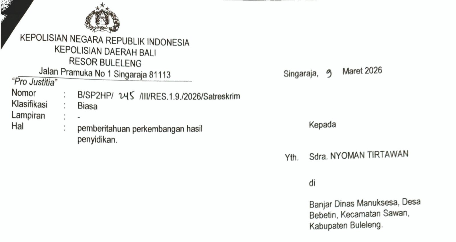 – 9 Maret 2026: Kepolisian Resor Buleleng mengeluarkan surat resmi pemberitahuan perkembangan penyidikan.